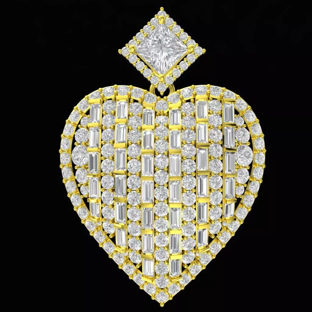 This luxury heart-shaped diamond pendant 3D model features a bold pavé design with a structured geometric layout. The heart surface is meticulously set with a combination of round brilliant and baguette-cut stones, creating a strong visual rhythm and high-end appearance.