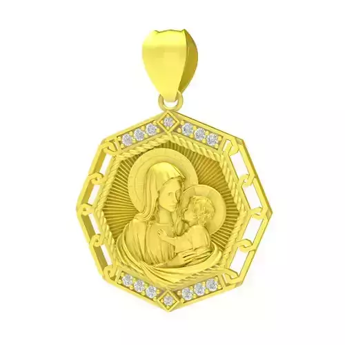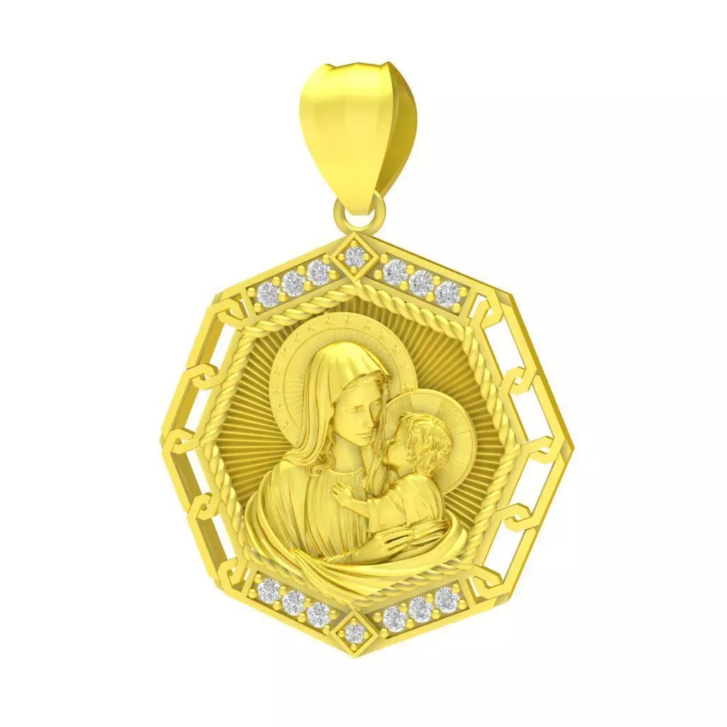 This luxury Virgin Mary and Child religious pendant 3D model is a refined and meaningful jewelry design created for professional fine jewelry production. The pendant features a detailed relief of the Virgin Mary holding the Holy Child, surrounded by a radiant halo background that symbolizes love, protection, and faith. The sacred scene is framed within an elegant octagonal structure, enhanced by decorative rope details and pavé gemstone accents.