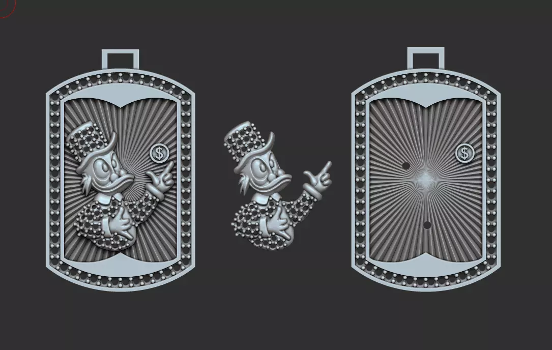 Modelo 3D de joyería listo para impresión, diseño de Mac Pato con placa diamantada, ideal para fabricación profesional en metales preciosos.