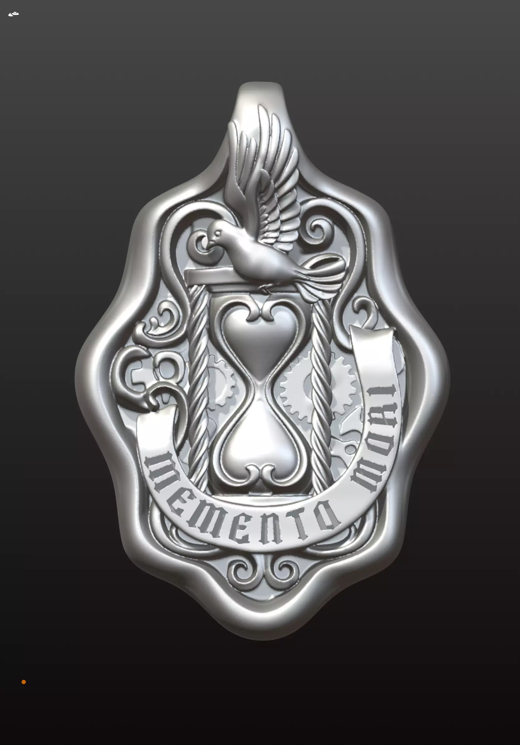 A highly detailed 3D jewelry model featuring a profound symbolic composition. The design centers around a heart-shaped hourglass, representing the intersection of love and time. A soaring dove rests atop the hourglass, symbolizing the peace and freedom of the soul, while mechanical gears and elegant scrolls frame the piece. The flowing ribbon at the bottom bears the classic Latin inscription MEMENTO MORI, serving as a timeless reminder to live every moment to the fullest.This piece is optimized for high-end jewelry production, looking exceptional in oxidized sterling silver or two-tone gold.