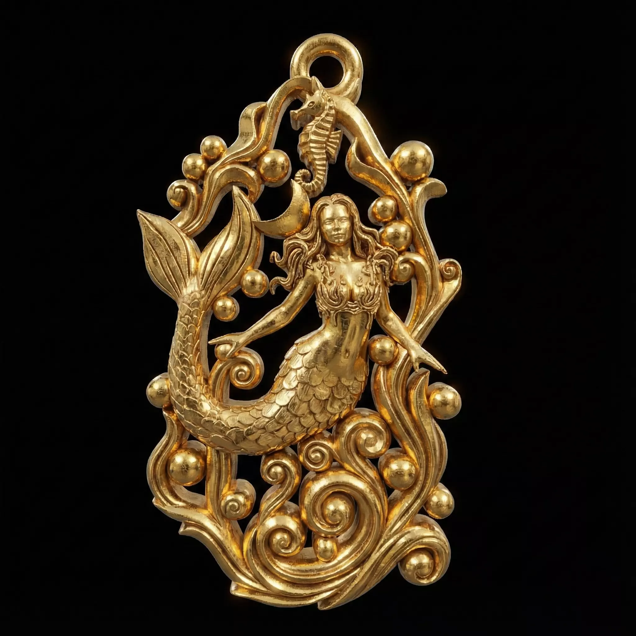 Description:Product Overview: Presenting a highly detailed, distinct 3D jewelry model of a Mermaid surrounded by swirling ocean waves and a seahorse accent. This piece is designed as a bas-relief pendant/charm, perfect for gold casting, silver jewelry, or CNC engraving. The design features a classical aesthetic with no stone settings required, making it ideal for direct metal casting.