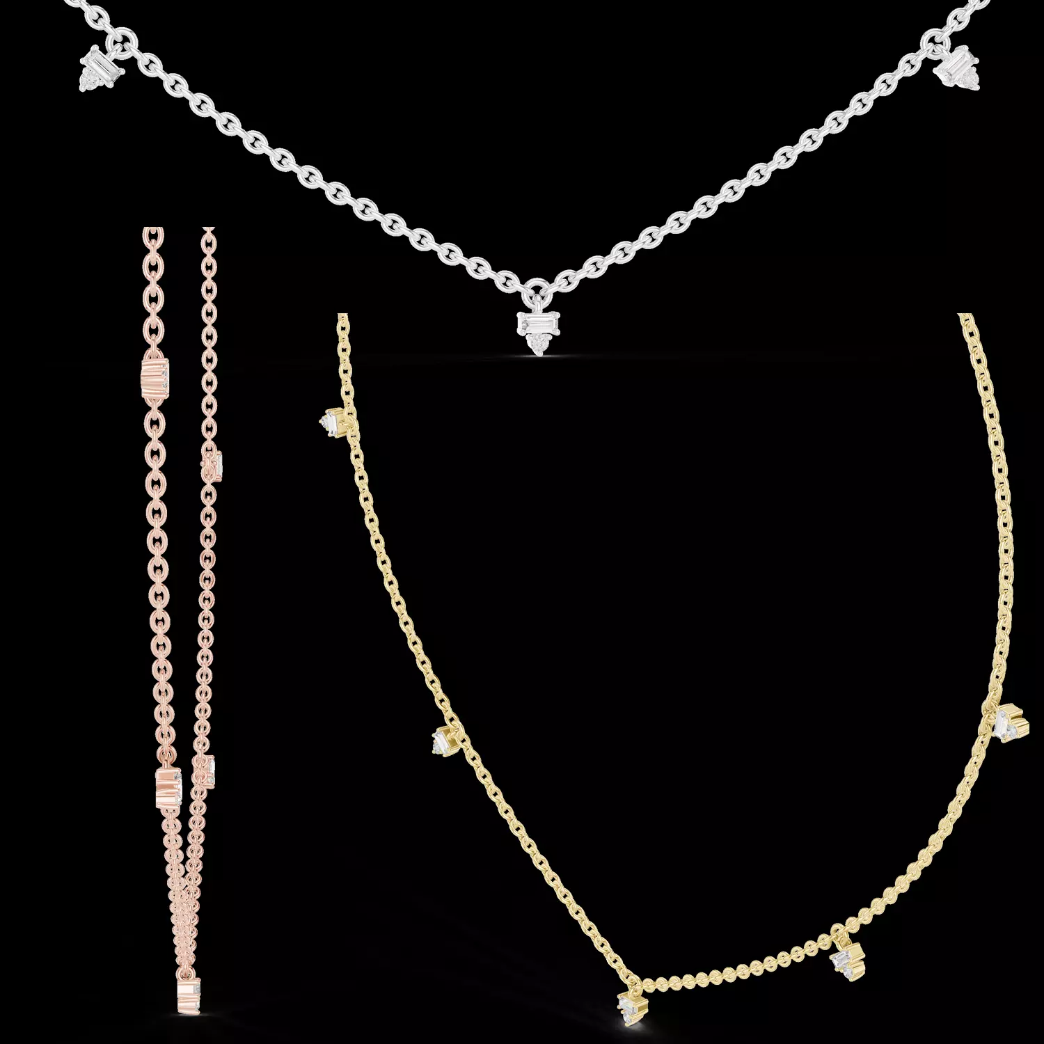 This Minimal Diamond Drop Charm Necklace 3D CAD model features a refined chain design accented with small geometric diamond drops. The layout combines modern simplicity with subtle sparkle, making it perfect for everyday luxury wear.