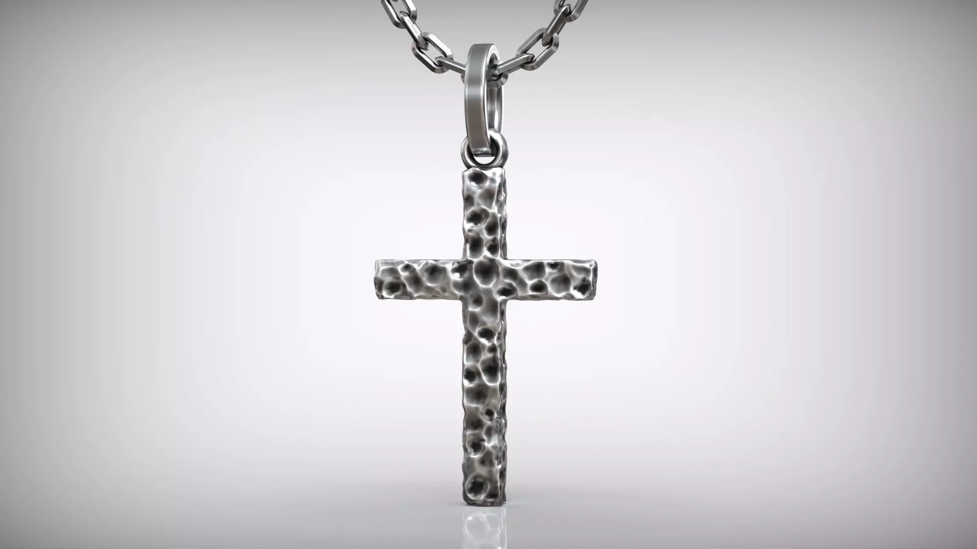 This 3D model depicts a minimalist cross pendant with a hand-hammered surface texture, evoking the look of forged metal craftsmanship. The design is both raw and refined — simple in form yet rich in tactile character. The irregular, softly dented texture reflects light in a subtle and natural way, giving the pendant a timeless vintage aesthetic.