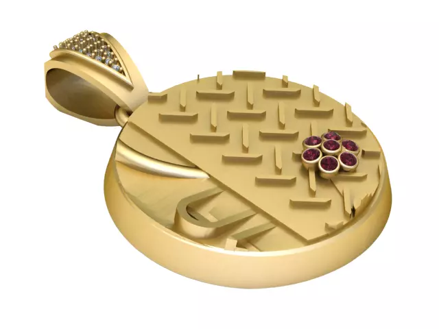 This contemporary round pendant merges geometric precision with floral elegance, creating a unique aesthetic statement. The pendant is artistically divided into two contrasting textures: one half features a smooth polished finish, while the other showcases a raised diamond-plate pattern for a bold, tactile look. A graceful abstract motif adds a fluid touch across the smooth half. A delicate floral cluster of deep red gemstones blooms on the textured side, adding a touch of color and refinement. Finished with a pavé diamond-studded bail, this pendant combines modern design with luxurious detail—perfect for everyday chic or standout layering.