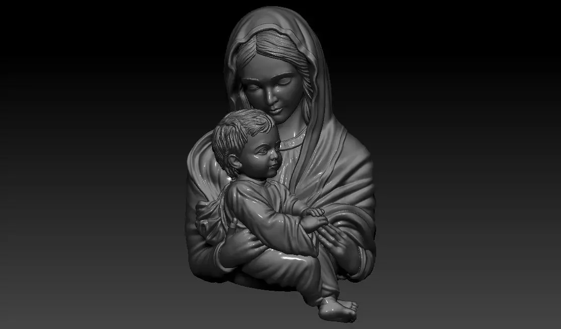 A beautifully detailed 3D sculpture of a mother lovingly holding her child, symbolizing warmth, protection, and eternal love. This model is crafted with soft, realistic folds in the drapery and gentle facial expressions that convey peace and devotion.