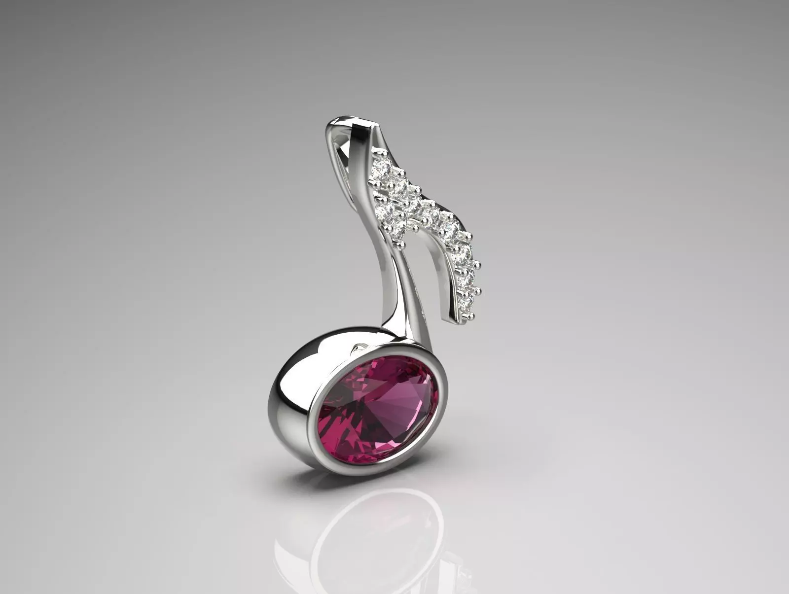 This image features a delicate and beautiful pendant designed in the shape of a musical note, specifically a harp (eighth note). The body of the pendant is made of shiny and polished metal, likely silver or white gold. The circular part of the pendant contains a large, faceted pink gemstone that adds vibrant color and sparkle to the piece. The stem of the pendant is decorated with a row of small, sparkling gemstones that enhance its luxurious appearance. The background is simple and neutral, highlighting the sparkle and detail of the jewelry.