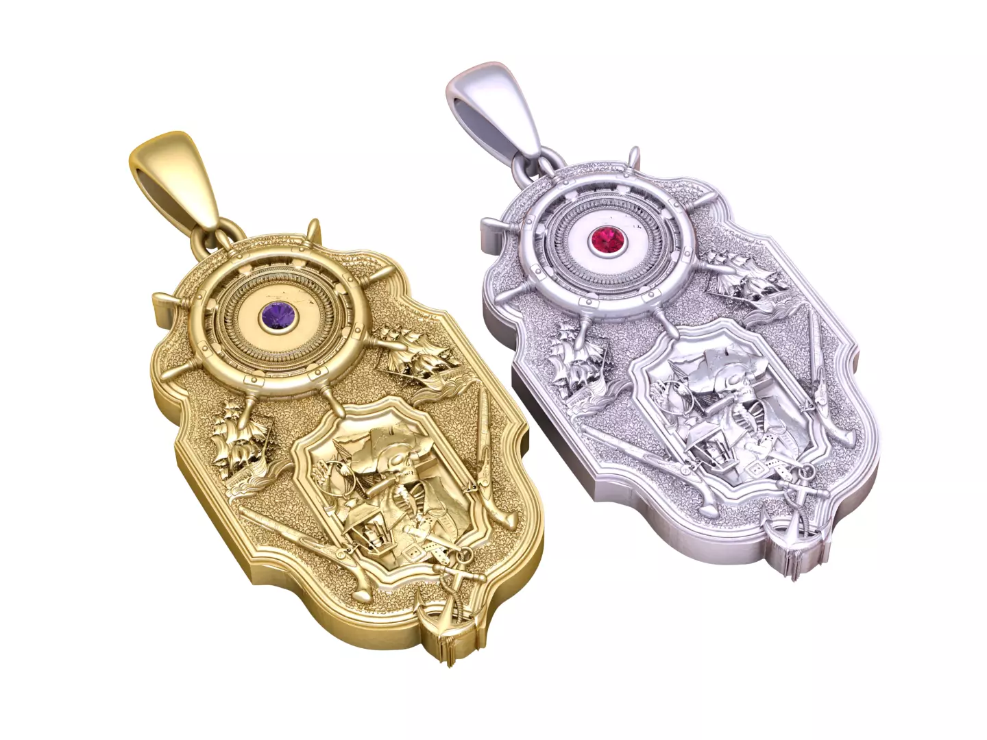 This exquisitely detailed Nautical Guardian Medallion Pendant blends maritime symbolism with luxury craftsmanship. Featuring a bold ship’s wheel at the center, accented by a gemstone setting, the design represents guidance, control, and direction in life’s journey. Surrounding nautical elements such as anchors, ships, and maritime tools add depth and storytelling to the pendant, making it a powerful symbol of protection, adventure, and resilience. Available in both gold and silver finishes, this pendant is ideal for statement jewelry, sailor-inspired collections, or luxury 3D-printed and cast jewelry designs. Perfect for those who feel a deep connection to the sea, leadership, and exploration.