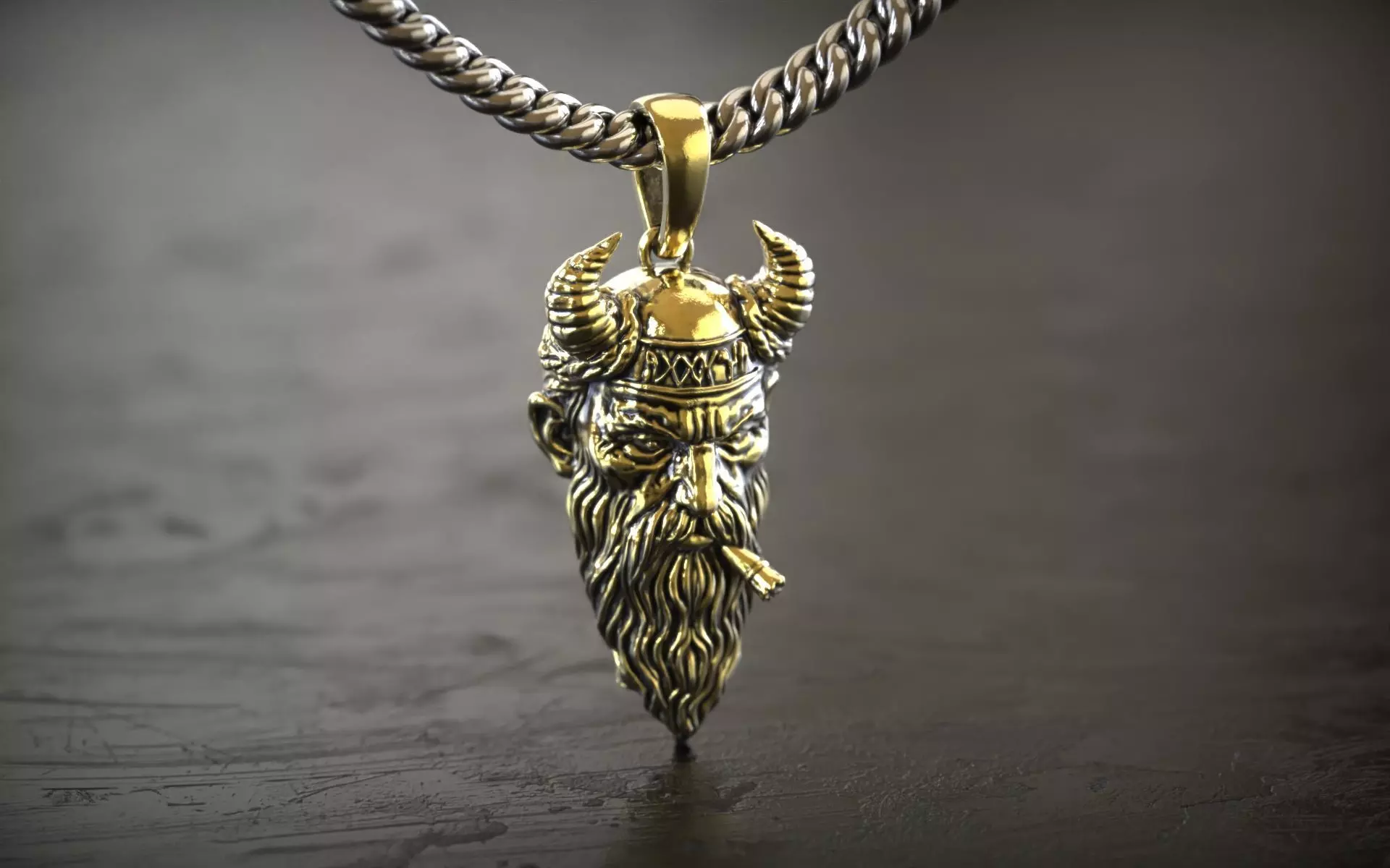 A masterfully crafted 3D render of a golden-bronze warrior pendant, featuring a stoic, bearded face adorned with imposing curved horns and a signature cigar. The intricate detail of the flowing beard and weathered helmet, paired with a heavy-duty curb chain, creates a powerful and rugged luxury aesthetic perfect for high-end masculine accessory branding.