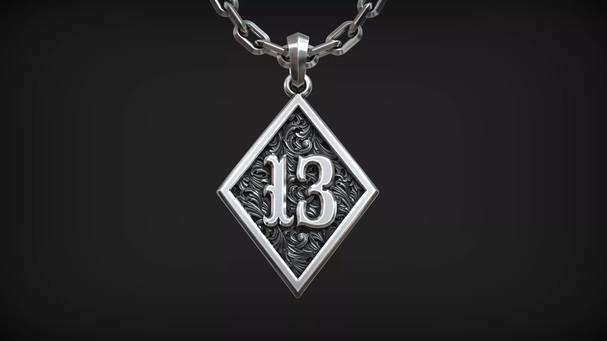 This 3D model presents a striking Number 13 Gothic Pendant, designed with a refined balance of symbolism and ornamental artistry. The pendant follows a diamond-shaped (rotated square) silhouette, giving it a bold and elegant presence suitable for modern and alternative jewelry collections.