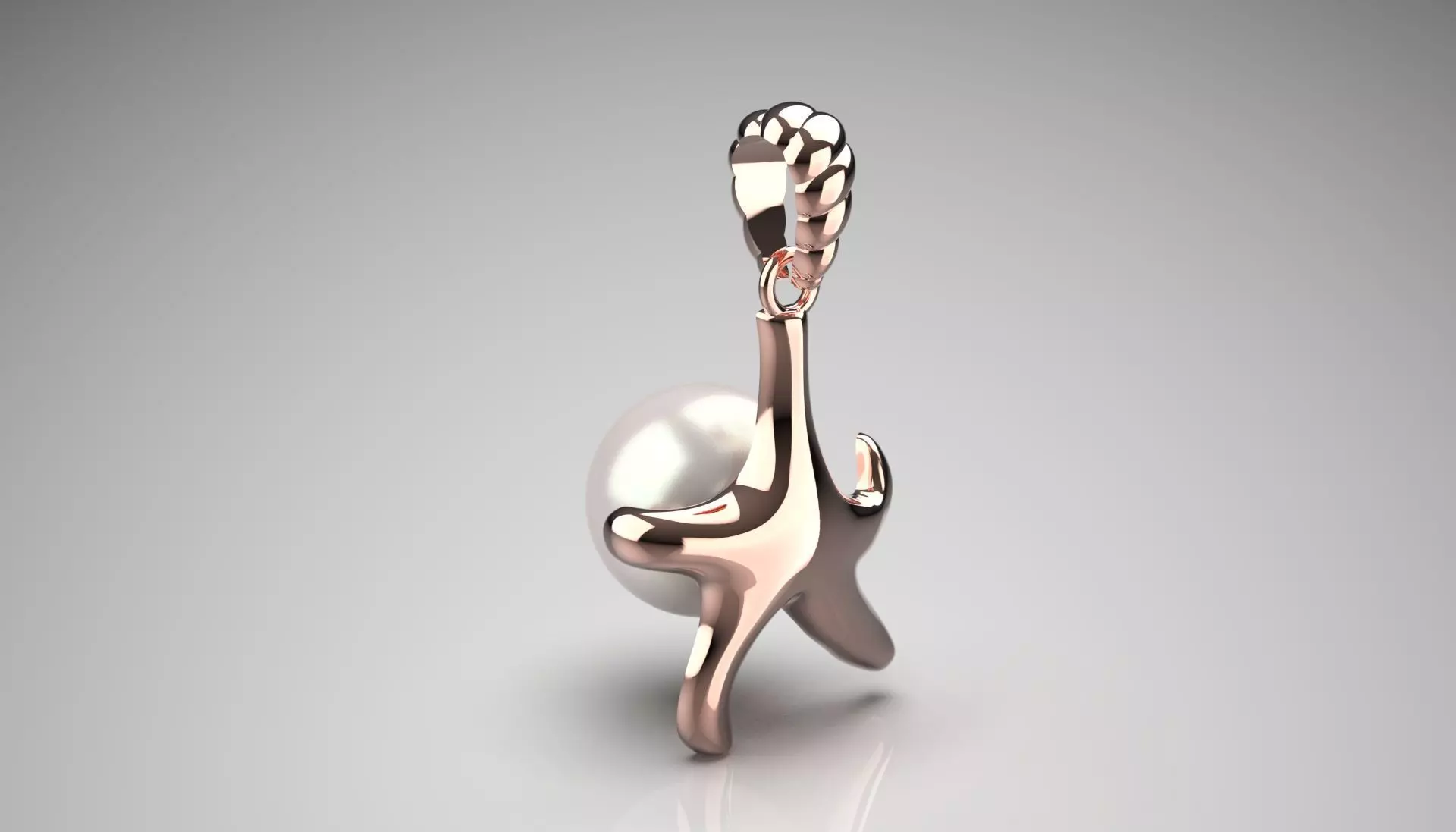 This pendant features a starfish-like design crafted from rose gold. At its center is a smooth, round pearl that adds a subtle contrast to the starfish’s organic shape. The gold has a polished finish that gives it a warm, reflective quality.