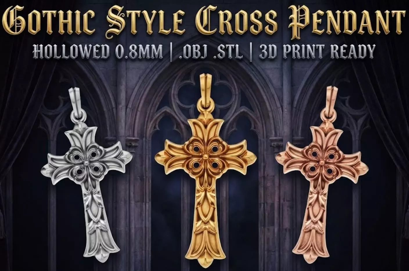 This gothic cross pendant is a high-detail jewelry model designed for professional production and high-resolution resin printing. The design features intricate, cathedral-inspired scrollwork and sharp fleur-de-lis accents, providing a classic, heavy aesthetic in a lightweight format.