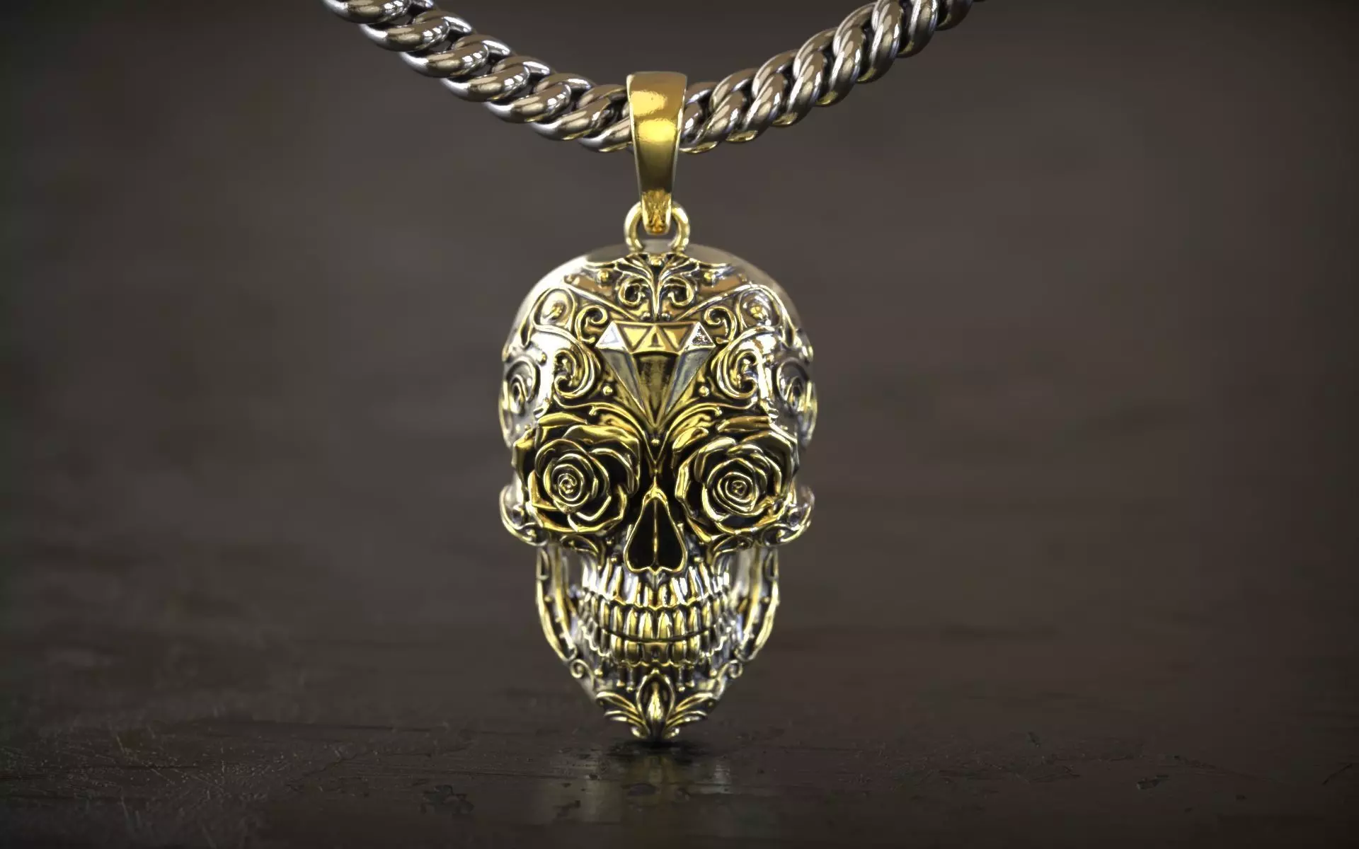 A beautiful fusion of Memento Mori and romantic artistry. This skull pendant features blooming roses in place of eyes and a prominent diamond-shaped facet on the forehead. The entire cranium is covered in delicate filigree scrollwork, reminiscent of traditional Sugar Skull (Calavera) designs. This piece is ideal for those seeking a Day of the Dead aesthetic or a sophisticated piece of gothic jewelry that balances themes of life and death.