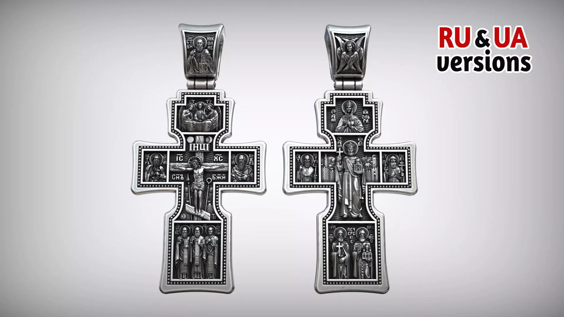 This Orthodox Kyiv-style cross pendant is a highly detailed religious jewelry design deeply rooted in Eastern Christian tradition. The composition reflects canonical Orthodox iconography and is carefully structured to convey theological meaning and spiritual hierarchy.