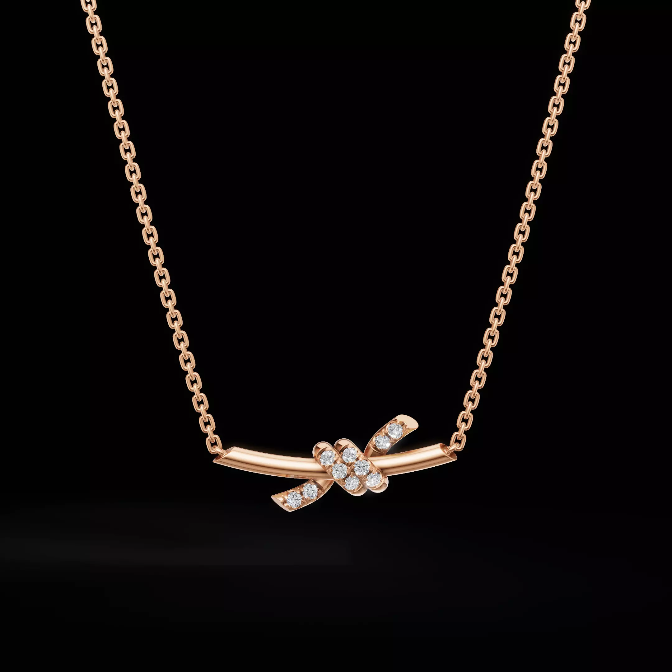 The pendant features an elegant knot motif formed by softly curved tubular elements, symbolizing connection and continuity. One side of the knot is accented with pavé-set round stones, adding subtle brilliance while maintaining a clean and sophisticated appearance. The proportions are carefully balanced to ensure both visual harmony and comfortable wear.