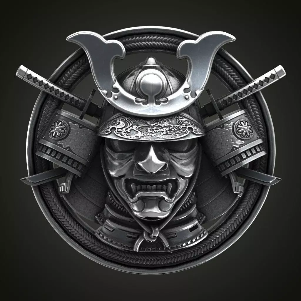 Samurai pendant made in OBJ and STL formats, ready for 3D printing. On the reverse side, the hieroglyph SAMURAI
