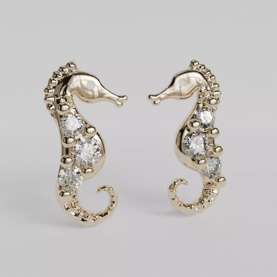 pendientes caballos de mar en oro de 18 kilates7.50 x 3.80 mm1 piedra de 1.25 mm y 2 piedras de 1mm por modelo0.98 gramos aproximadamente