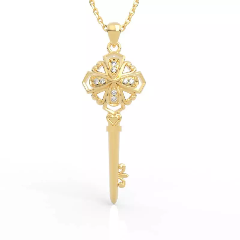 The Shaped Clover Key Pendant Diamond translates Byzantine romance and Neo-Gothic structure into a production-ready jewelry CAD design. A diamond-shaped key head frames a four-petal heart clover, edged with sharp architectural points that give the pendant its ceremonial presence. It looks intricate, yet it’s engineered to cast cleanly.