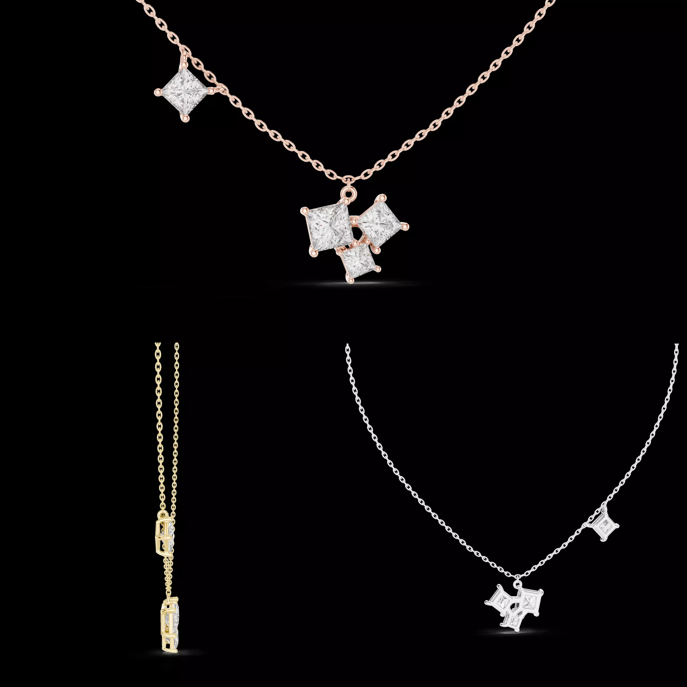This modern pendant design features a refined cluster of princess-cut diamonds arranged in a clean geometric composition. The layout delivers a contemporary yet elegant appearance, making it ideal for fine jewellery collections that demand precision and balance.
