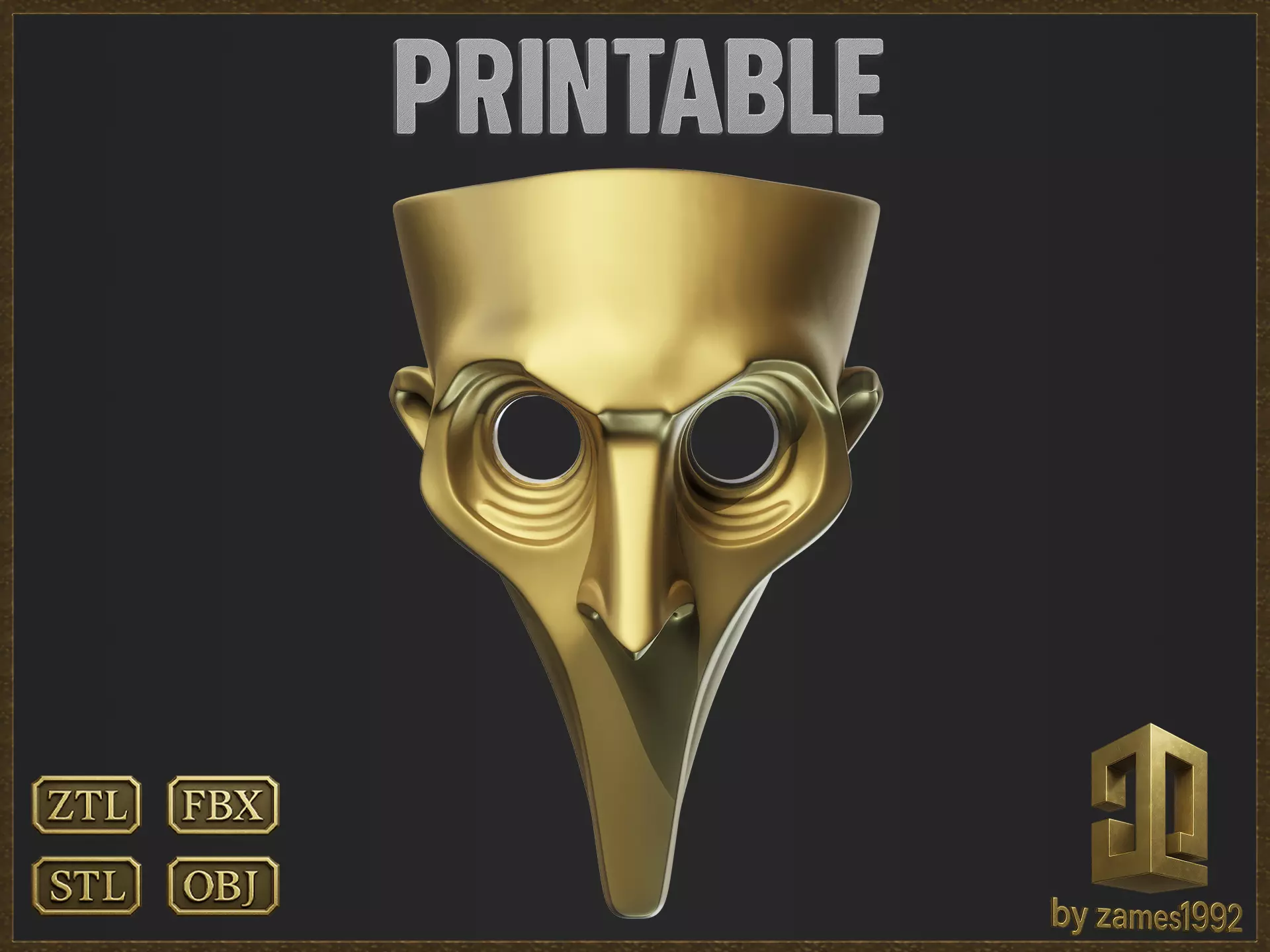 Printable Plague Doctor Mask Files included: ZTL master sculpt, STL, OBJ, FBX