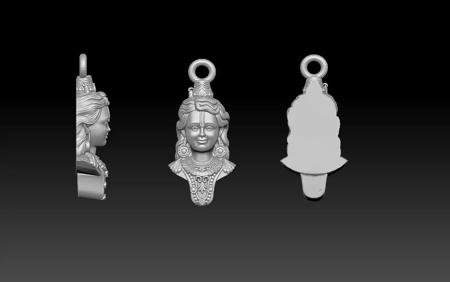 This image shows a 3D digital STL model of the Hindu deity Ram Lalla, the infant form of Lord Rama, specifically as depicted in the Ayodhya temple. The model is presented from three angles—side profile, front view, and back view—to serve as a comprehensive reference for 3D printing or jewelry design. The design is intricately crafted for applications like creating pendants, lockets, or keychains. It captures detailed features of the deity, including a traditional headdress, ornate jewelry (earrings and necklaces), and a serene facial expression. The top of the model includes a bail or ring attachment, indicating its intended use as a wearable accessory. Key CharacteristicsPurpose: Optimized for jewelry CAD (Computer-Aided Design), casting, and high-detail 3D printing.File Format: Typically provided as an STL file, which is the standard format for 3D printable objects.Symbolism: Represents the childhood (Balak) form of Lord Rama, often used as a spiritual amulet for protection and blessings