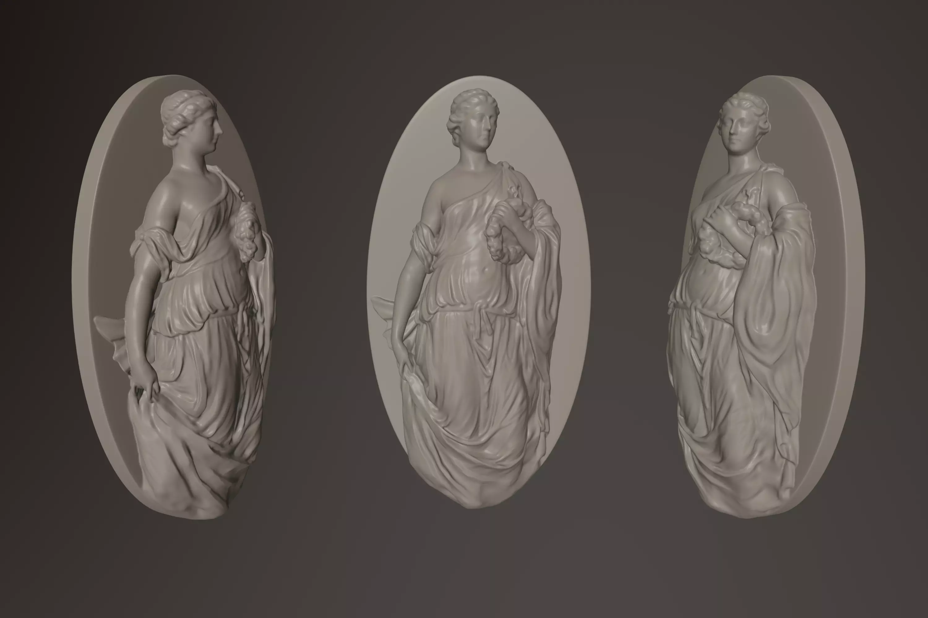 This is a meticulously crafted 3D model, presenting a modern reinterpretation of a classic Renaissance Flora sculpture. Designed as a relief piece, it features a graceful female figure (Flora, goddess of flowers and spring) adorned with flowing drapery, encapsulated within an elegant oval frame.