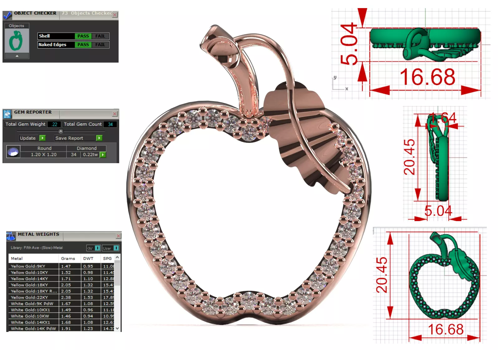 - Diamond Setting: The entire border and outline of the apple is covered with Small Round Diamonds.