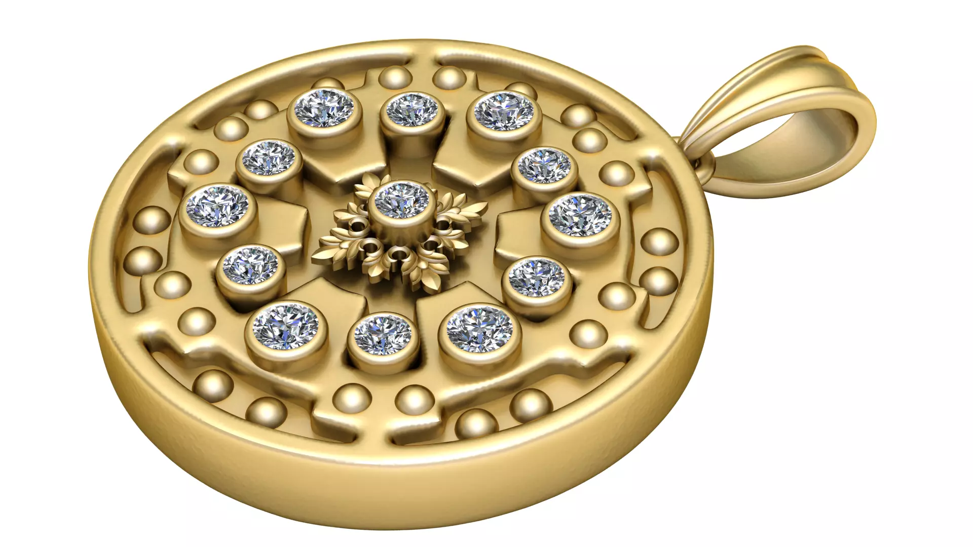 This elegant round gold pendant features a beautifully balanced floral-inspired design with multiple bezel-set round diamonds arranged in a circular pattern. At the center, a detailed floral motif holds a sparkling diamond, creating a luxurious focal point. The surrounding diamonds and decorative gold beads enhance the pendant’s symmetry and richness, giving it a classic yet contemporary appearance.