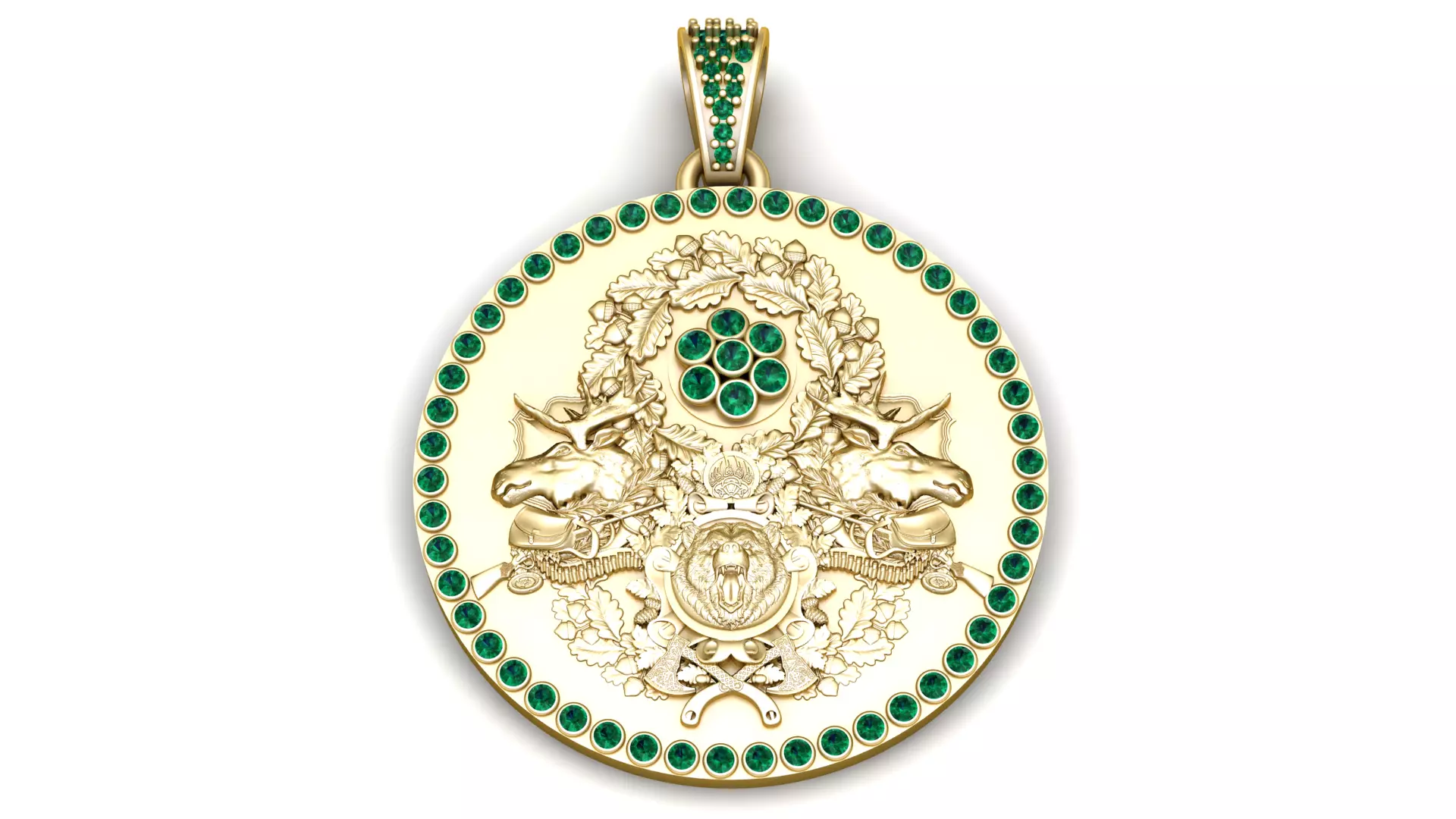 This Royal Crest Pendant is a masterpiece of elegance and symbolism, designed for those who value heritage, strength, and prestige. The pendant features two majestic stags facing outward, symbolizing nobility and endurance with a roaring lion emblem at the center representing courage and power. Surrounding the design are intricately detailed oak leaves, a timeless symbol of honor and victory. The pendant is adorned with vivid green gemstones along the border, as well as clustered at the top center and on the bail, adding a striking contrast against the polished gold surface. This regal piece is perfect as a statement accessory reflecting authority pride and timeless artistry