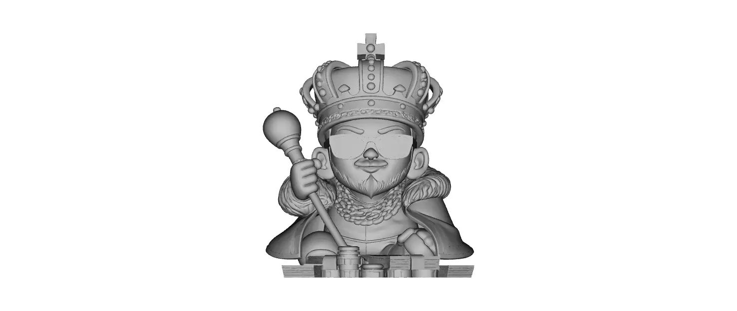 This Royal Hip-Hop King Character Figurine features a bold cartoon-style king wearing a detailed crown, heavy chains, royal cape, and sunglasses, holding a scepter while sitting on stacks of cash. The design blends luxury, power, wealth, royalty, and street culture, creating a striking and highly collectible character sculpture.