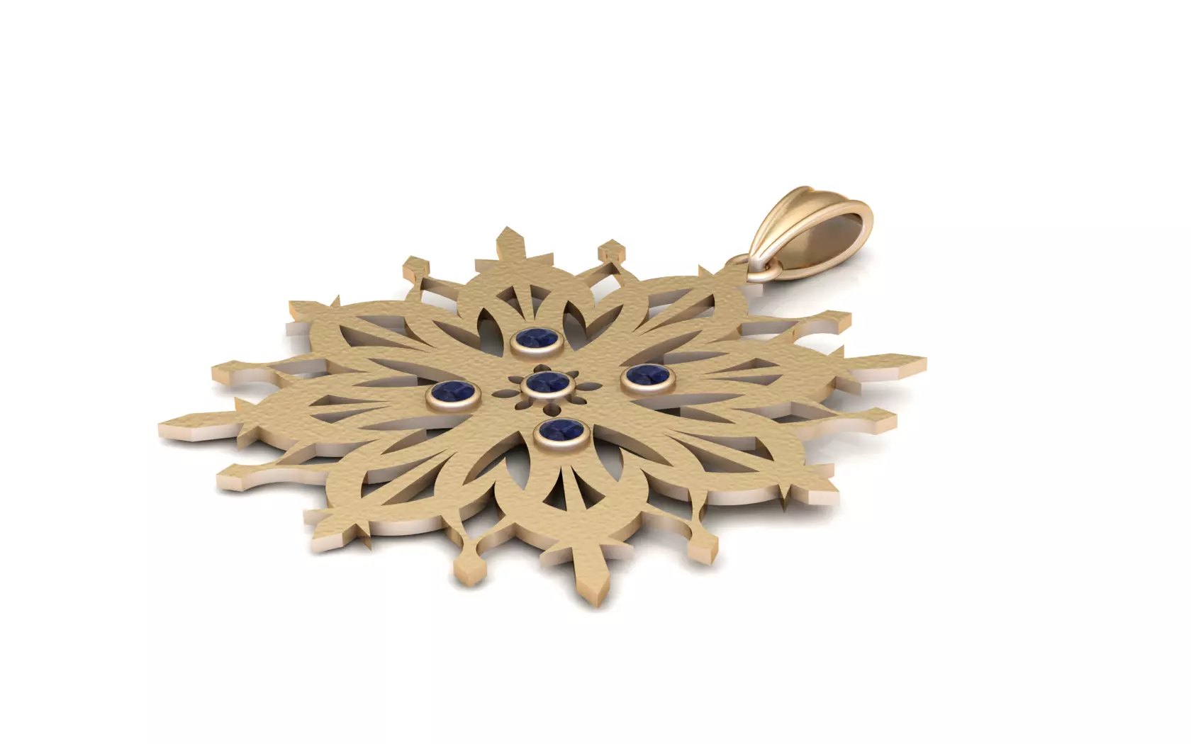 This exquisite snowflake-inspired medallion pendant showcases a harmonious blend of symmetry, elegance, and fine craftsmanship. Designed with intricate cutwork and a refined matte-gold texture, the pendant features deep blue sapphire-like stones delicately set at the center and radial points, adding a regal contrast to the warm gold tone.