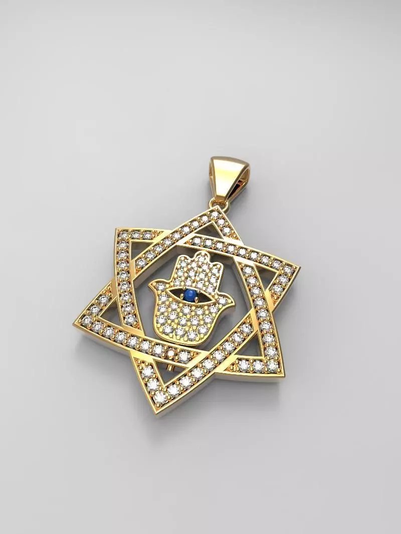 RUBY design a gold pendant with a hamsa hand inside a Star of David. The hamsa hand is a palm-shaped symbol that is widely used as an amulet in Middle Eastern and North African cultures. It is believed to provide protection against the evil eye. The Star of David is a hexagonal symbol that is one of the most recognizable symbols of Judaism. It is often used in jewelry and other decorative items.The pendant made of 14K gold. The hamsa hand and Star of David are both outlined with small diamonds. The pendant is attached to a delicate gold chain.This type of pendant is a popular choice for people who want to express their faith or heritage. It can also be seen as a symbol of good luck and protection.
