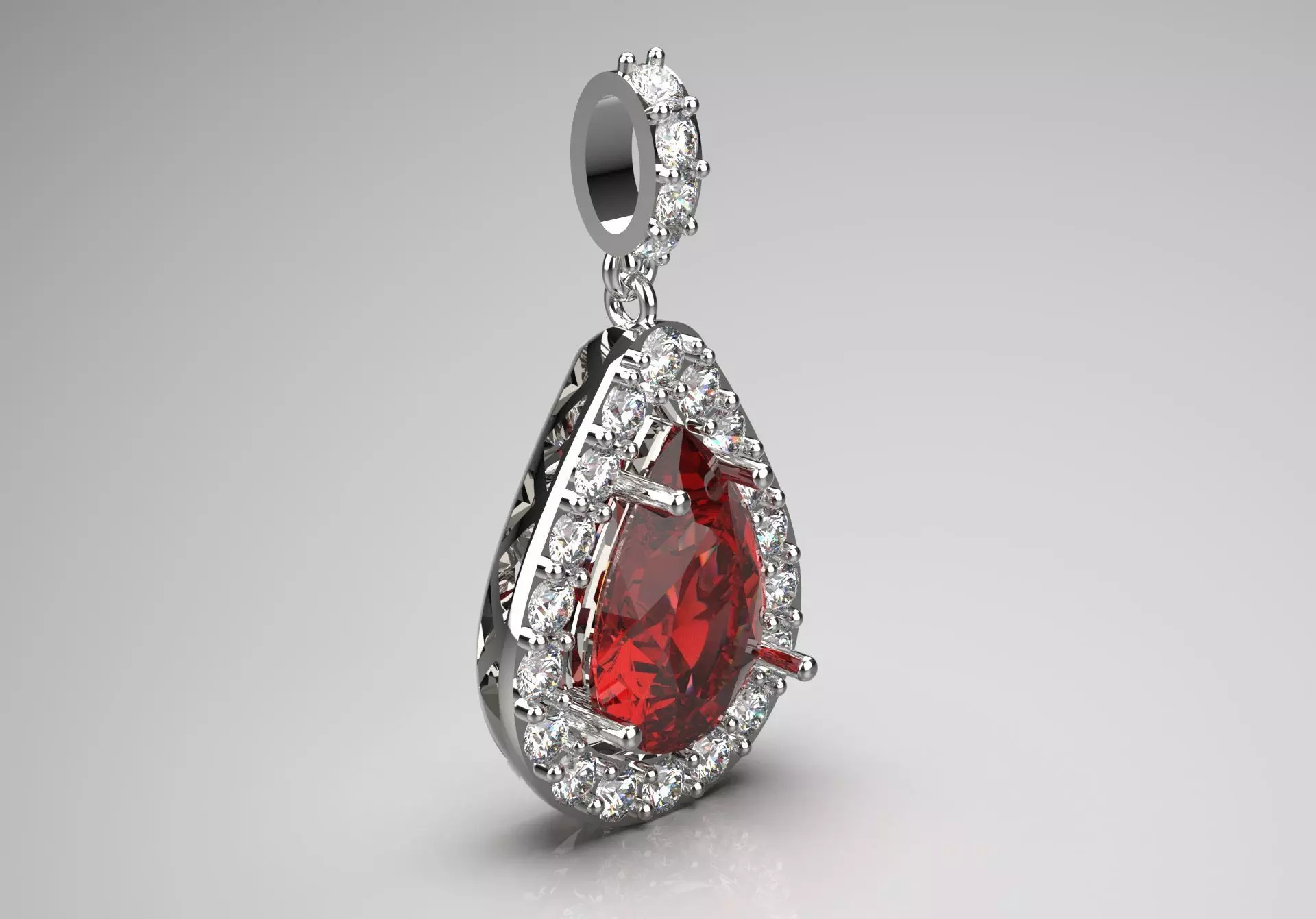 This pendant showcases a stunning teardrop-shaped red ruby gemstone beautifully set in a polished white gold setting. The center gem is surrounded by a halo of smaller round diamond stones, enhancing its brilliance and creating a subtle contrast against the deep red color. The intricate detailing on the pendant's cord and the quality of the finish add to its luxurious appeal. Perfect for special occasions or as a statement accessory, this striking piece embodies both sophistication and glamour.