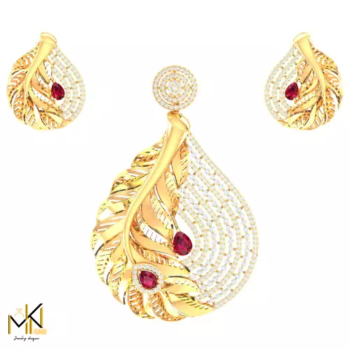 Ruby Raindrop Luxe SetThis luxury gold pendant and matching earrings 3D model features an elegant leaf-inspired design, adorned with pavé-set diamonds and vivid red ruby gemstones at the center. The intricate detailing, flowing curves, and gemstone placement make this set perfect for jewelry designers, CAD specialists, and 3D visual artists looking for models suitable for product rendering, AR/VR experiences, animations, and 3D printing.