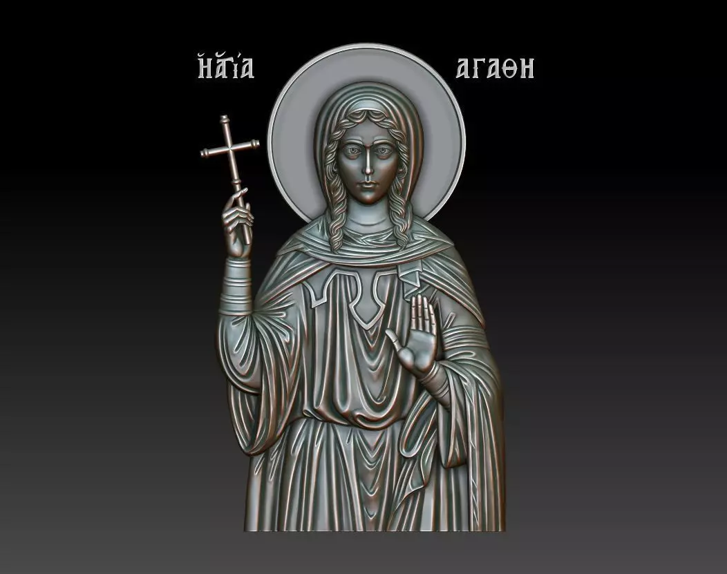3d model Orthodox icon Saint Agatha of Sicily (Saint Agatha of Panorma (Palermo, Catania, Sicily)). For milling on CNC machines or 3d printing. Can be used in the production of souvenirs, furniture, jewelry. Files in stl format, for import to artcam, rhinoceros, 3ds max, etc. You can scale the model to any size you need.3d model Orthodox icon Saint Agatha of Sicily (Saint Agatha of Panorma (Palermo, Catania, Sicily)) in high-detail 3D relief Suitable for CNC milling and 3D printing STL format, scalable to any size Compatible with ArtCAM, Rhinoceros, 3ds Max Ideal for religious souvenirs, furniture, jewelry, and interior décor This versatile model is a valuable tool for anyone looking to create beautiful, precise religious designs across a wide range of applications.This model is perfect for artisans and manufacturers creating religious-themed items such as iconography, church décor, or custom gifts. Its high level of detail ensures precise output when milled or 3D printed, maintaining a professional finish. It’s also ideal for woodworking, metal engraving, or resin casting.Ideal for CNC carving, 3D printing, and laser engraving. This model is perfect for creating religious wall plaques, personal devotional items, church décor, and spiritual gifts.