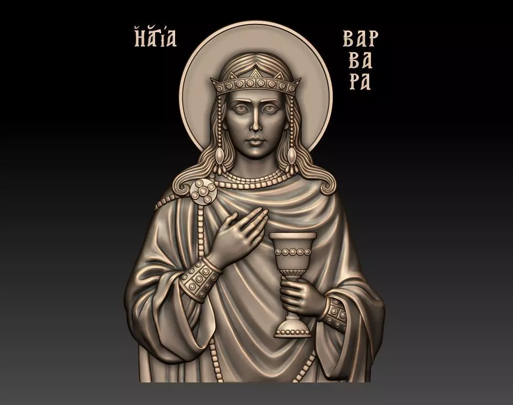 3d model Orthodox icon Saint Barbara of Nicomedia ((Ancient Greek: Ἁγία Βαρβάρα; Coptic: Ϯⲁⲅⲓⲁ Ⲃⲁⲣⲃⲁⲣⲁ; Church Slavonic: Великомученица Варва́ра Илиопольская; Arabic: القديسة الشهيدة بربارة), known in the Eastern Orthodox Church as the Great Martyr Barbara) This is a high-quality STL relief model of Saint Barbara of Nicomedia, a revered Christian martyr and one of the Great Martyrs of the Orthodox Church. She is depicted in a traditional Byzantine style holding a chalice, symbolizing her role as a protector against sudden death and lightning.