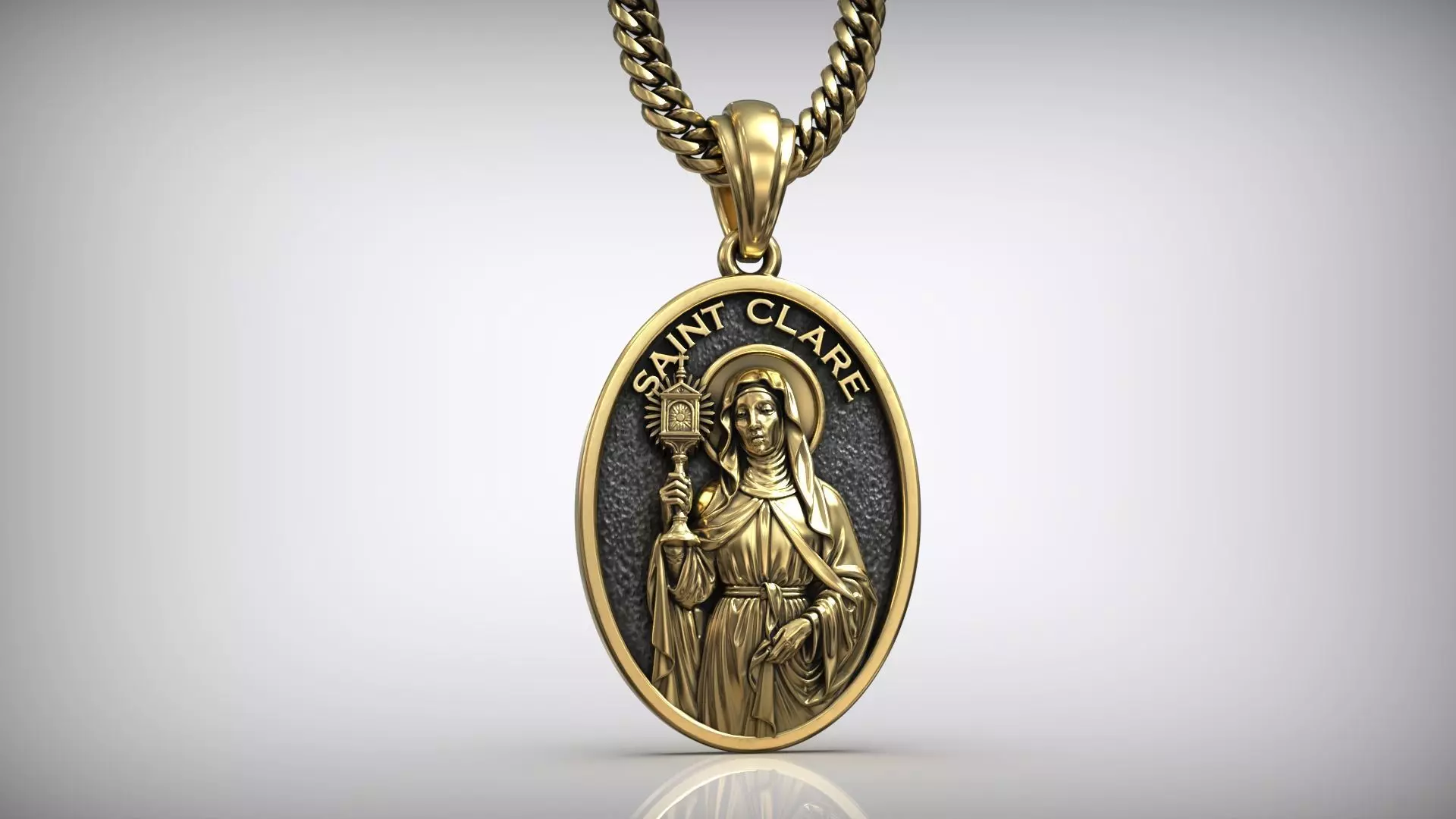 This 3D model represents an elegant oval pendant featuring Saint Clare of Assisi, the beloved founder of the Poor Clares and a symbol of devotion, humility, and unwavering trust in God. The medallion displays Saint Clare holding a beautifully detailed monstrance, referencing the miracle in which she repelled invaders through the power of the Holy Eucharist.