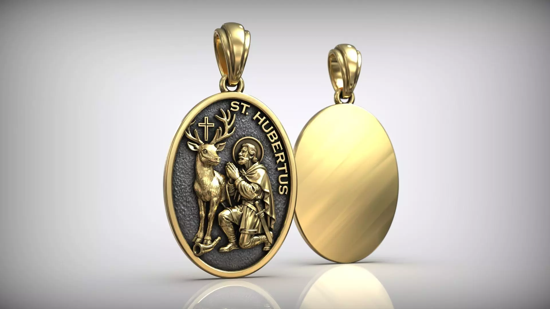This 3D model presents a beautifully detailed medal-style pendant featuring Saint Hubertus, the patron saint of hunters, depicted in a traditional pose kneeling before a stag with a radiant cross between its antlers. The design is rendered in high-relief style, ideal for fine jewelry casting.