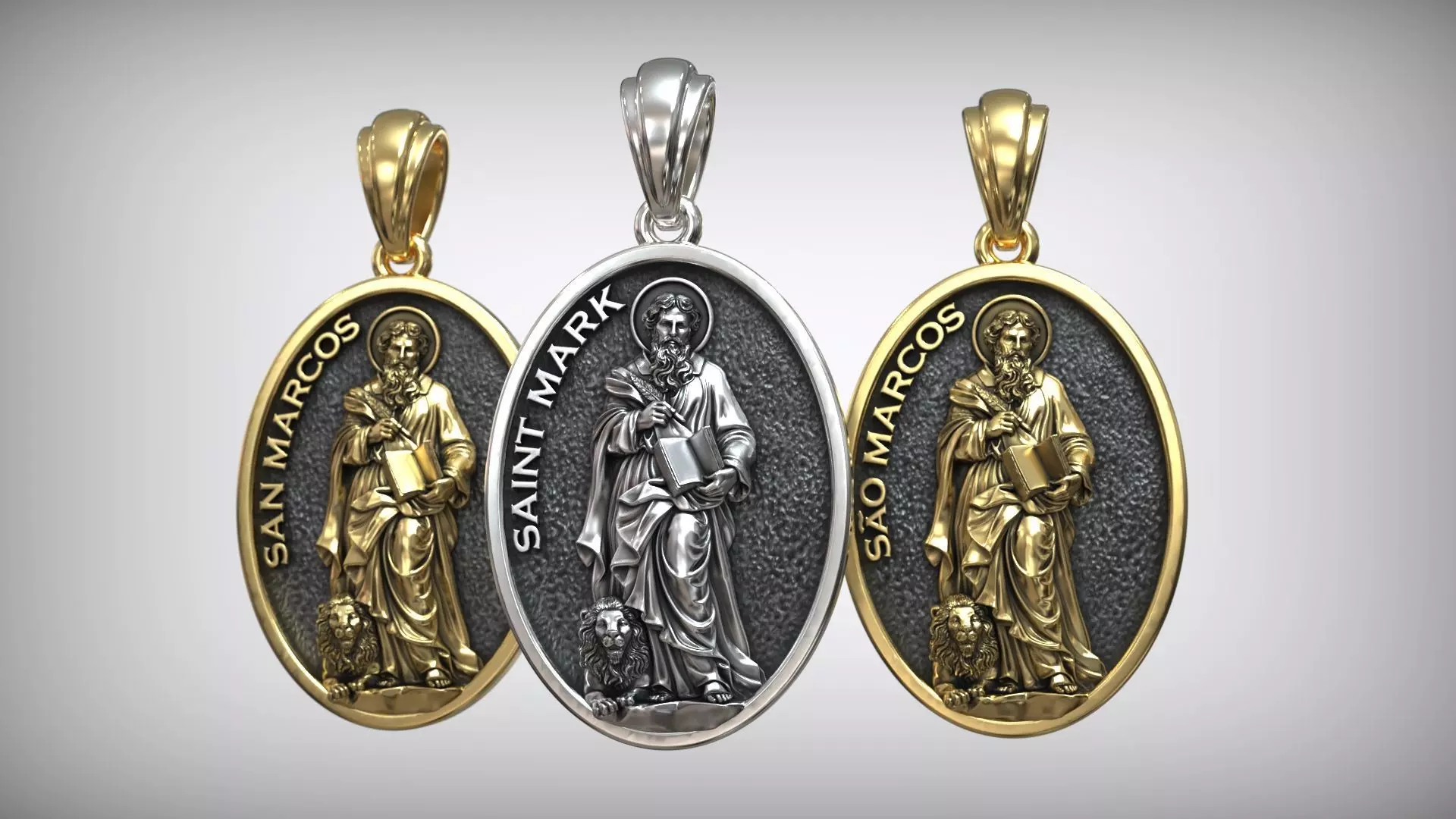 The background has a textured surface that enhances depth and contrast, making the raised figure stand out prominently. The inscription “SAINT MARK” (or language variations such as SAN MARCOS / SÃO MARCOS) frames the upper part of the pendant, allowing flexibility for different markets.