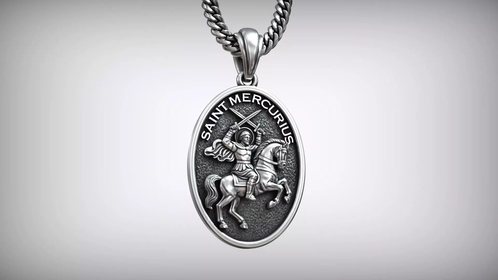 This 3D model features a detailed oval pendant depicting Saint Mercurius, the legendary warrior saint known for his bravery and unwavering faith. The design showcases Saint Mercurius mounted on a rearing horse, holding two crossed swords above his head - a powerful symbol of divine strength and protection.