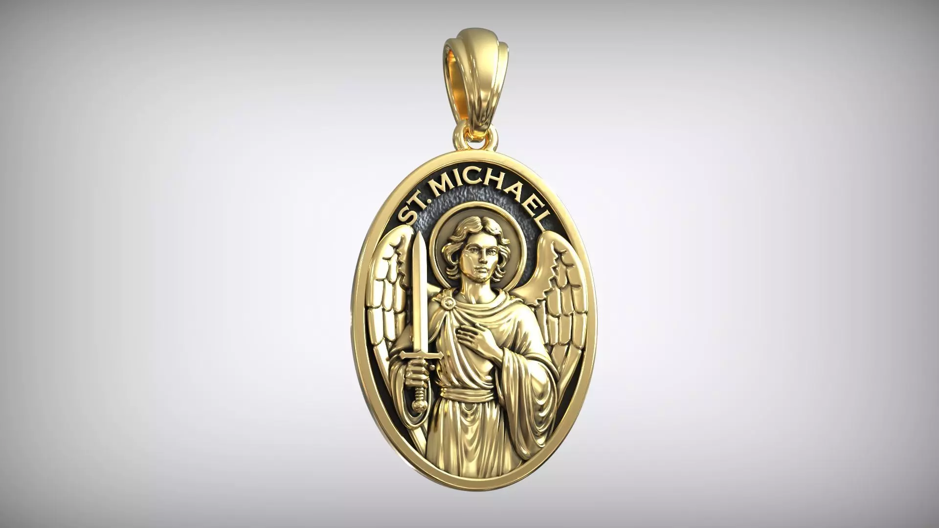 This 3D model depicts a beautifully detailed oval pendant of St. Michael the Archangel, crafted in a classical religious style. The front side shows St. Michael with a sword, symbolizing protection and strength, while the reverse side is kept smooth and polished, ideal for engraving or customization. The design is optimized for jewelry production in silver or gold and can be used for 3D printing or CNC milling. This model is suitable for religious jewelry collections, gift items, or personal devotion.