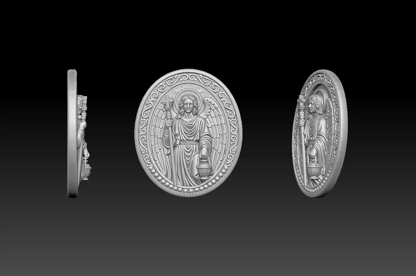 This image features a high-fidelity 3D digital sculpt of a circular religious medallion depicting the Archangel Raphael, revered as the Medicine of God and the patron of healing and travelers. The design is rendered in intricate bas-relief, showing the archangel with majestic feathered wings and holding his most iconic attributes: a pilgrim's staff representing guidance through the journey of life, and a vessel (often containing healing balm or the gall of a fish) symbolizing his role in the miraculous restoration of health. The model is presented from three professional perspectives—profile, front, and three-quarter view—to showcase the precise sculptural depth of the figure and the detailed ornate border. This professional digital asset is specifically engineered for jewelry manufacturing, such as casting silver or gold pendants, or for high-precision CNC engraving on religious tokens and commemorative medals. A guide for the journey, a balm for the soul: the eternal healing of Saint Raphael.