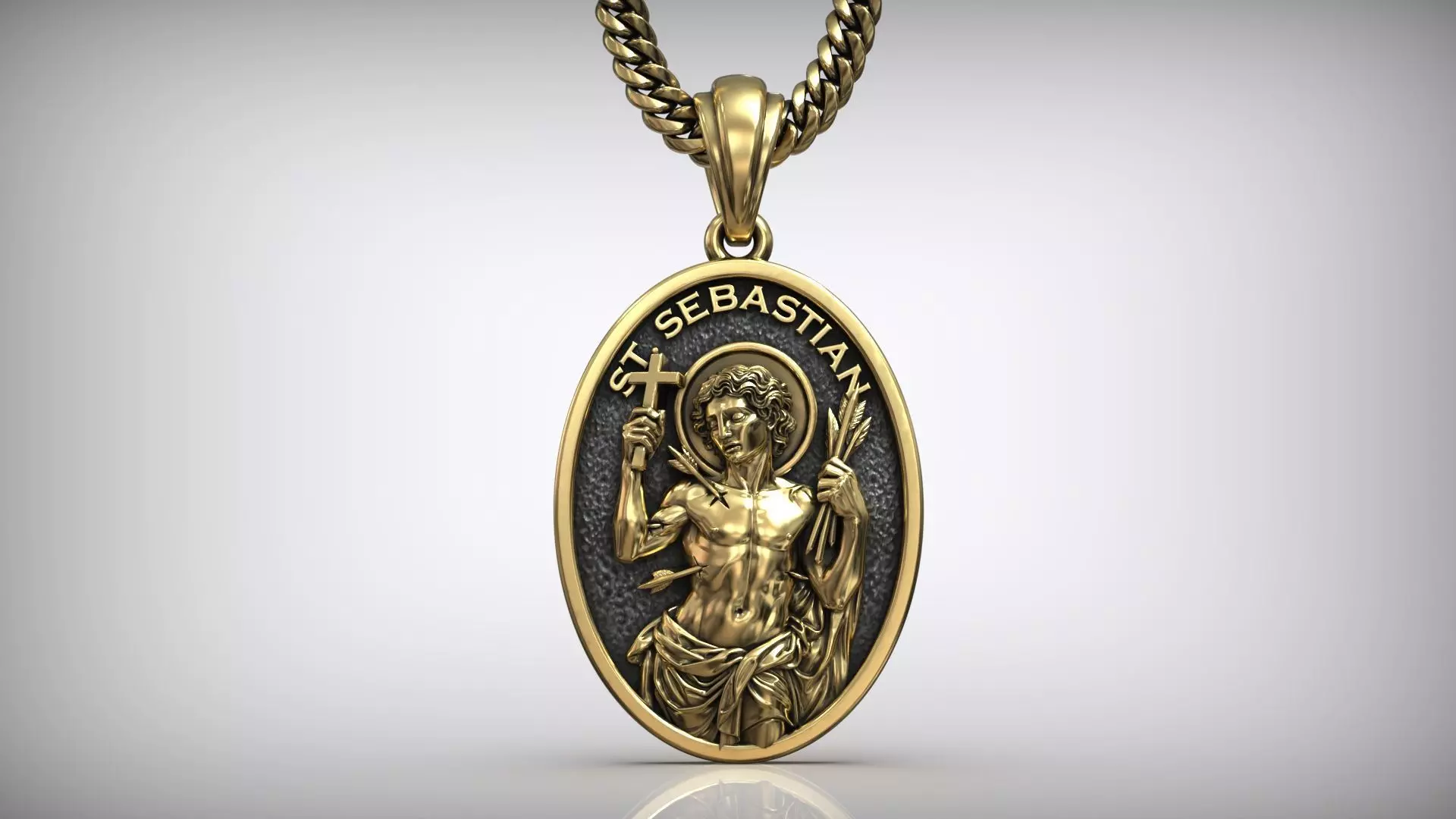 This 3D model presents an elegant oval pendant dedicated to Saint Sebastian, the revered Christian martyr known as a protector against plagues and a symbol of faith, endurance, and spiritual resilience. The medallion features a highly detailed bas-relief of Saint Sebastian with arrows piercing his body — a traditional iconographic depiction - rendered with exceptional anatomical accuracy and emotional depth.