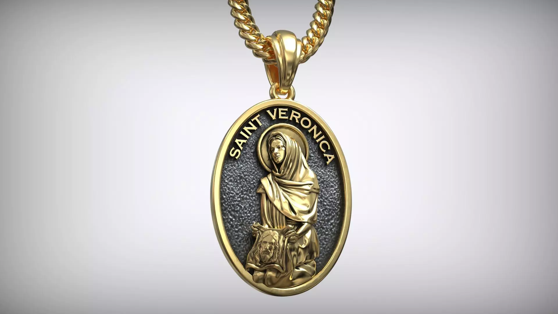 This 3D model represents an elegant pendant featuring Saint Veronica, rendered in a beautifully detailed bas-relief style. The saint is shown holding the Veil of Christ, a symbol of compassion and faith. The composition is framed within an oval medallion with a finely textured background that contrasts with the polished gold finish of the figure. The inscription “SAINT VERONICA” is engraved in raised lettering along the upper edge, emphasizing its sacred and refined appearance.