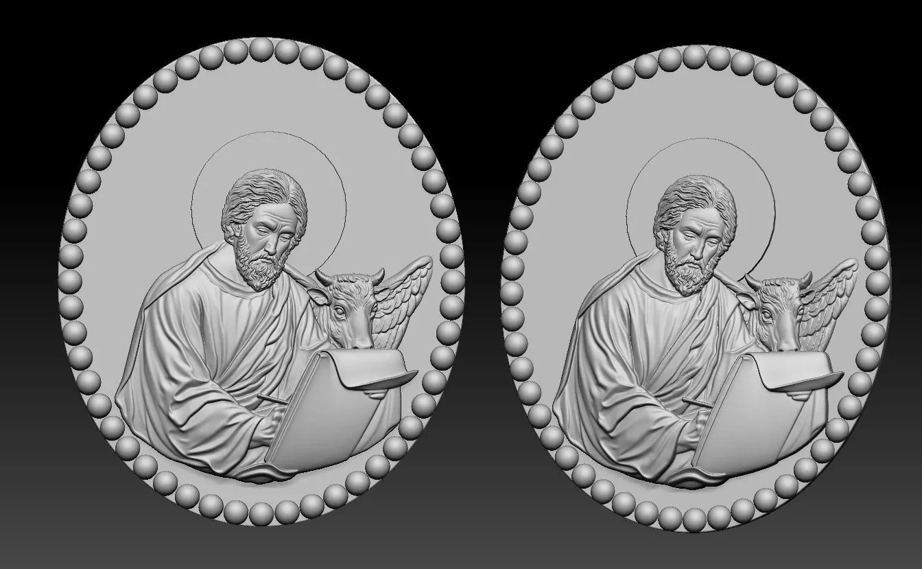 Object type: Religious bas-relief medallionTheme: Saint writing Gospel with symbolic animalShape: Oval medallion with beaded borderRelief type: 2.5D bas-reliefGeometry: Clean, watertight, CNC-safeDetail level: High, suitable for fine carvingFormats included: STL, OBJ