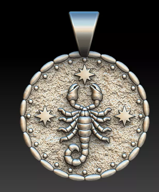 This Scorpio zodiac pendant 3D model is designed as a refined high-relief medallion, featuring a detailed scorpion motif surrounded by star elements and a textured background.The sculptural details are extremely sharp and clean, giving the pendant a refined, elegant look that remains clear and well-defined after casting and polishing.
