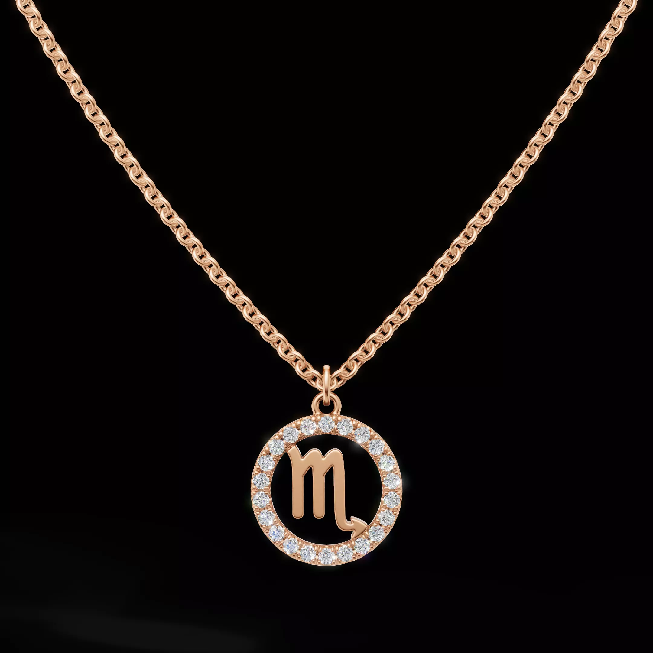 This Scorpio zodiac pendant 3D jewelry model features a clean circular silhouette with pavé-set gemstones around the outer halo and the iconic Scorpio symbol placed at the center.