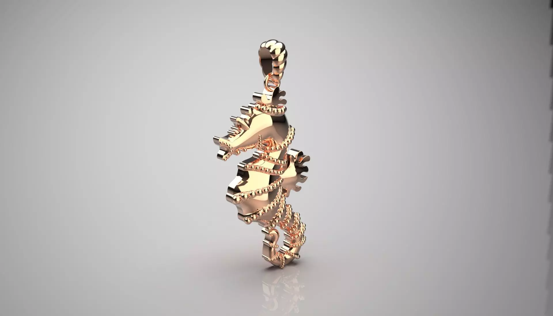 This pendant has a beautiful sea horse design that has complex details to display the unique texture of its body. It has a golden rose gold coating that reflects the light beautifully and enhances its complex features.