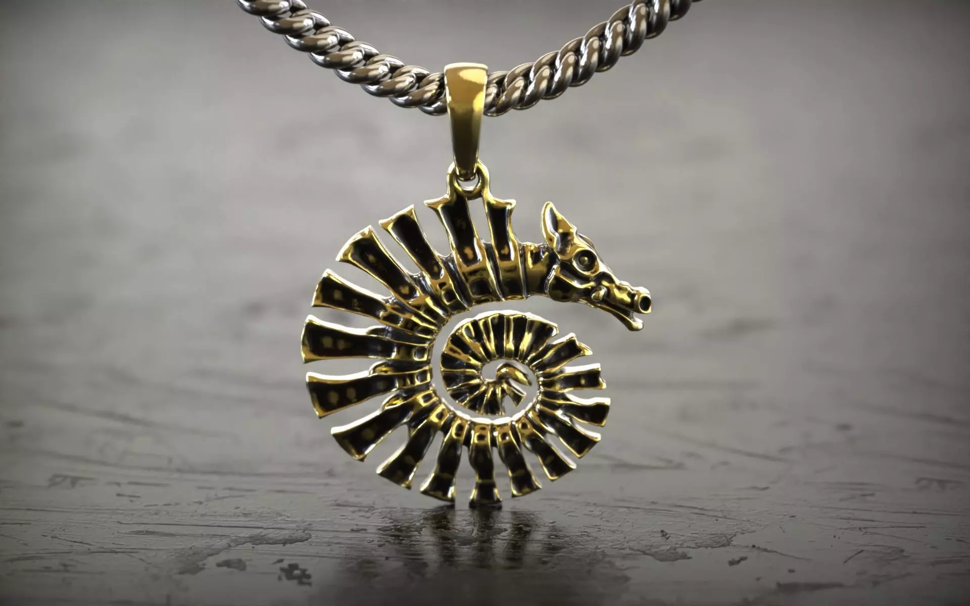 Dive into a blend of biology and geometry with this Nautilus Seahorse Pendant. This high-quality 3D model reimagines the traditional seahorse silhouette by curling it into a perfect Fibonacci-style spiral. The design features a striking segmented or ribbed texture that mimics skeletal structures found in the deep sea, providing a look that is both organic and avant-garde.