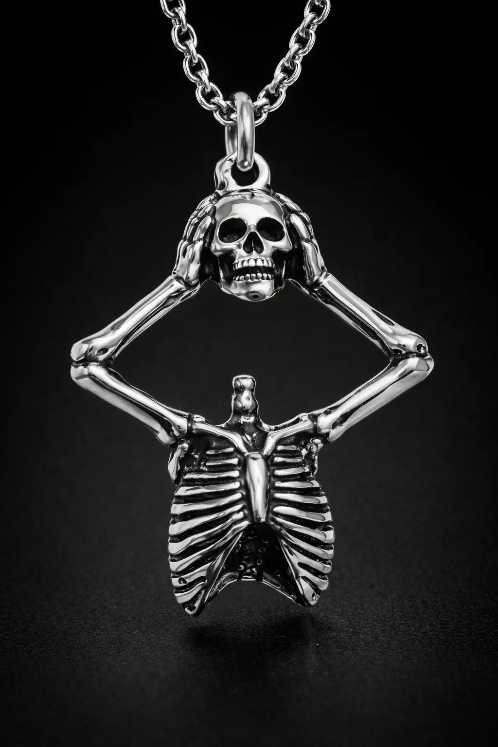 This high-resolution 3D model features a striking, macabre design of a skeleton holding its own skull, integrated seamlessly with a highly detailed ribcage. Designed specifically for professional jewelry designers and 3D printing enthusiasts, this piece balances dark, anatomical themes with clean, elegant lines suitable for high-end casting in silver, gold, or brass.