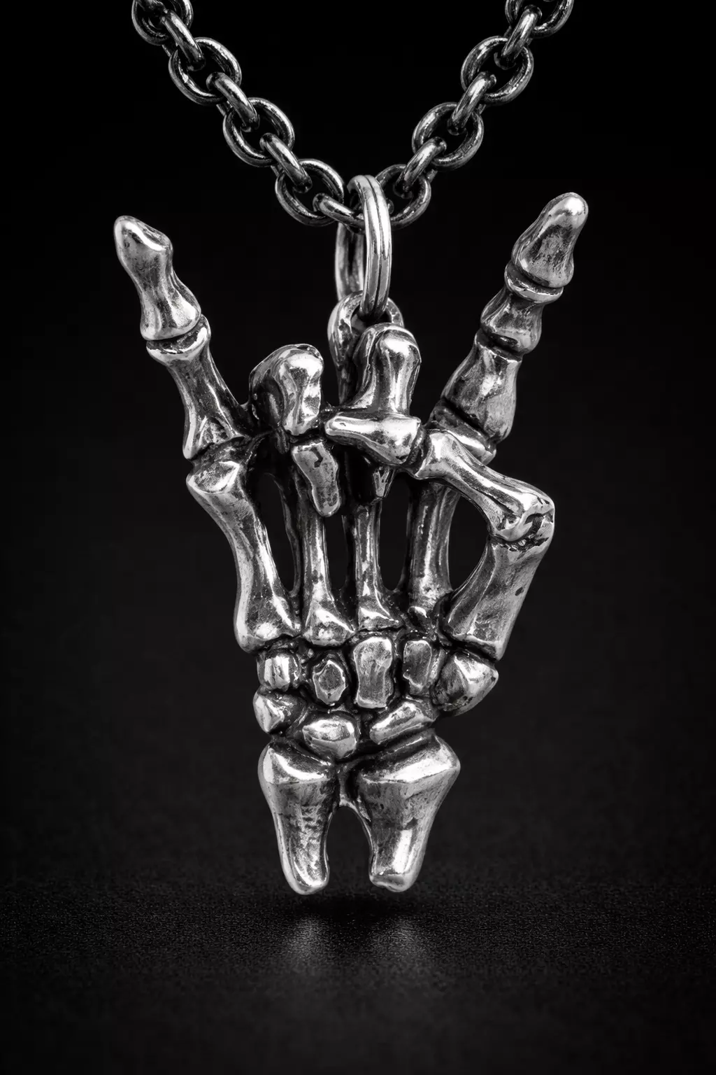 This design features an anatomically inspired skeletal hand striking the iconic Sign of the Horns gesture. Every phalange and joint is meticulously sculpted to provide a realistic, weathered look that excels when finished with an antique or oxidized silver polish. Perfect for musicians, metalheads, and the biker community, this model is a high-impact accessory designed for durability and style.